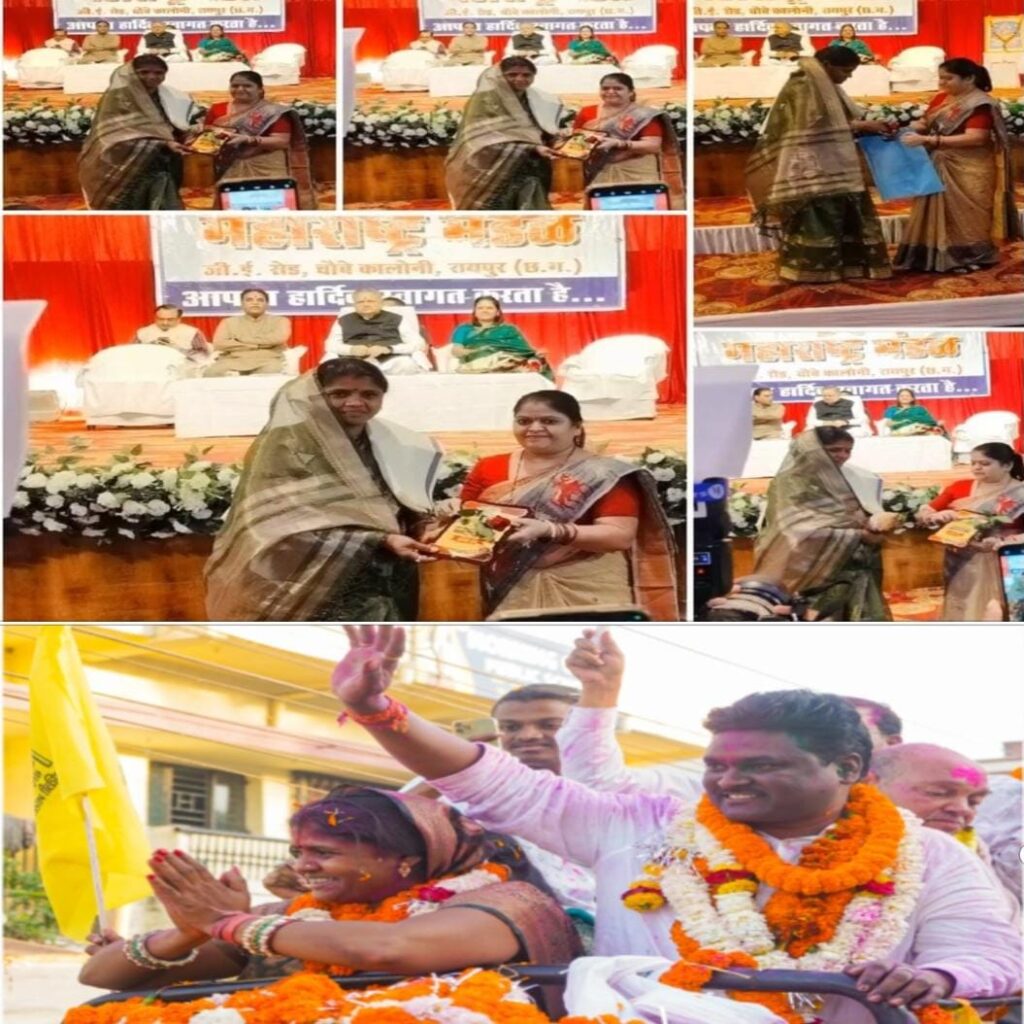 ///🙏महात्मा गांधी वार्ड 08 से सावित्री भारत धीवर को इतिहास जीत हासिल करने पर महाराष्ट्र मंडल एवं विधानसभा अध्यक्ष डां. रमन सिंह , महापौर मीनल चौबे, राजेश मूणत जी द्वारा सम्मानित एवं वार्ड के विकास कार्यों के लिए बधाई देते हुए 🙏/// इस सम्मान को सावित्री भारत धीवर ने पूरे महात्मा गांधी वार्ड क्रमांक 08 सड्डू की जनता सम्मान बताया और आभार व्यक्त किया और🙏 धन्यवाद🙏 कहा