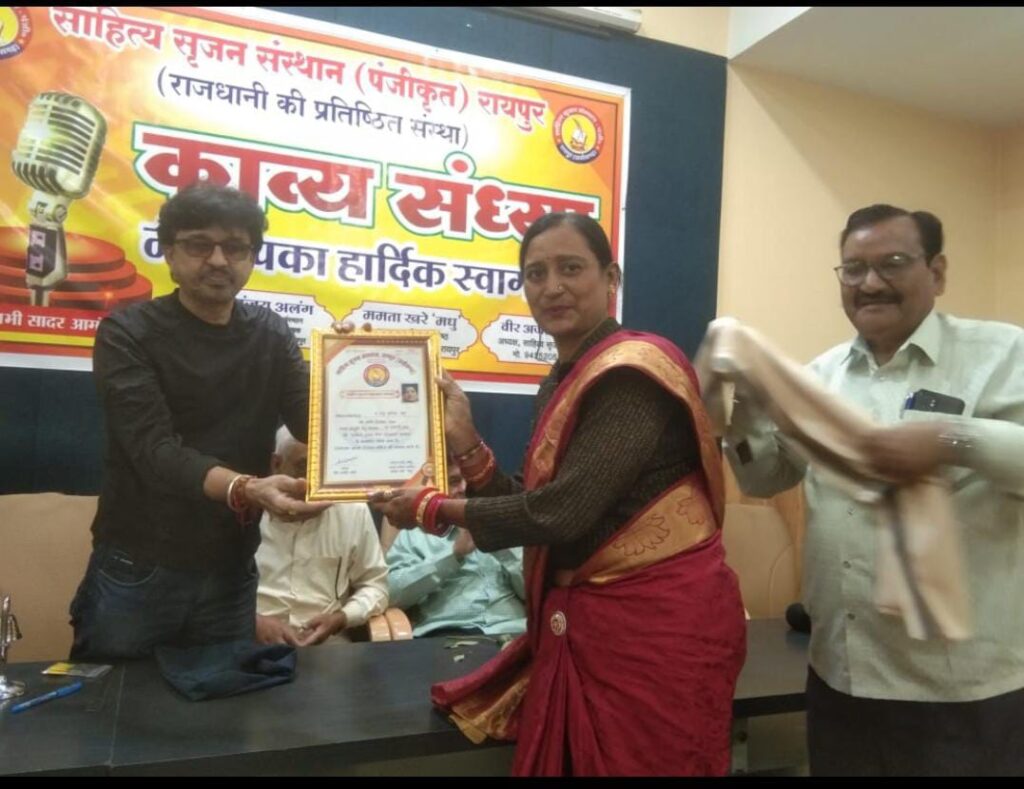 खरोरा..सृजन संस्थान के तत्वावधान में विगत दिवस 16 फरवरी,को वृंदावन हाल में आयोजित काव्य गोष्ठी में अंचल की प्रतिभाशाली कवयित्री पं अंजू पांडेय को साहित्य सृजन श्रेष्ठ रचनाकार सम्मान से सम्मानित किया गया।आंचल की इस कलमकार नेअपनी रचनाओं से समाज की विसंगतियों ,नारी की संवेदनाओं को चित्रित किया है।
