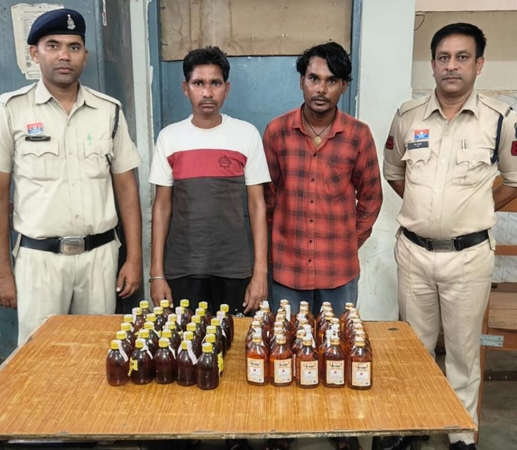 इसी क्रम में दिनांक 31.08.2025 को सूचना प्राप्त हुई कि थाना मंदिर हसौद क्षेत्रांतर्गत चंद्रखुरी फ़ार्म के पास दोपहिया वाहन में सवार 02 व्यक्ति अपने पास शराब रखे है तथा कहीं जाने की फिराक में है। जिस पर वरिष्ठ अधिकारियों के निर्देशन तथा थाना प्रभारी मंदिर हसौद के नेतृत्व में थाना मंदिर हसौद पुलिस की टीम द्वारा उक्त स्थान जाकर मुखबीर द्वारा बताये दोपहिया वाहन तथा हुलिये के व्यक्तियों को चिन्हांकित कर पकड़ा गया। पूछताछ में व्यक्तियों ने अपना नाम गणेश यादव एंड प्रीतम यादव निवासी मंदिर हसौद रायपुर का होना बताया। टीम के सदस्यों द्वारा उनके पास रखे थैले की तलाशी लेने पर उसमें शराब रखा होना पाया गया। शराब रखने एवं परिवहन करने के संबंध में दोनों से वैध दस्तावेज की मांग करने पर उनके द्वारा टीम के सदस्यों को किसी प्रकार को काई भी दस्तावेज प्रस्तुत न कर गुमराह किया जा रहा था।