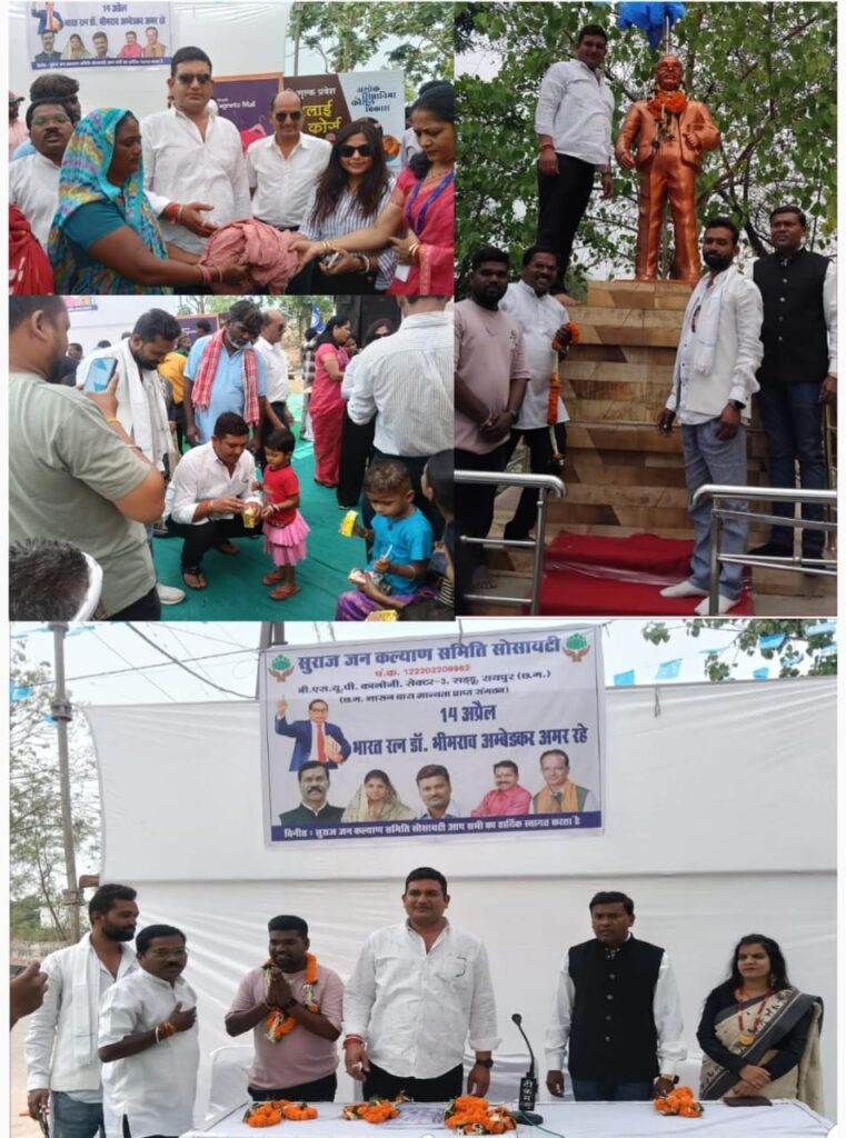 डॉ भीमराव अंबेडकर जयंती के शुभ अवसर पर डॉ भीमराव अंबेडकर के मूर्ति पर माल्यार्पण किया सुराज जन कल्याण समिति सोसाइटी एवं मैग्नेटो मॉल के द्वारा BSUP कॉलोनी सडू में निःशुल्क कपड़ा वितरण एवम बच्चों को स्वल्पाहार की व्यवस्था कराया गया कार्यक्रम में मुख्य अतिथि जोन क्रमांक 9 के अध्यक्ष वार्ड 9 के पार्षद गोपेश साहू शामिल हुए साथ ही बड़ी संख्या में आम जनता भी शामिल हुआ