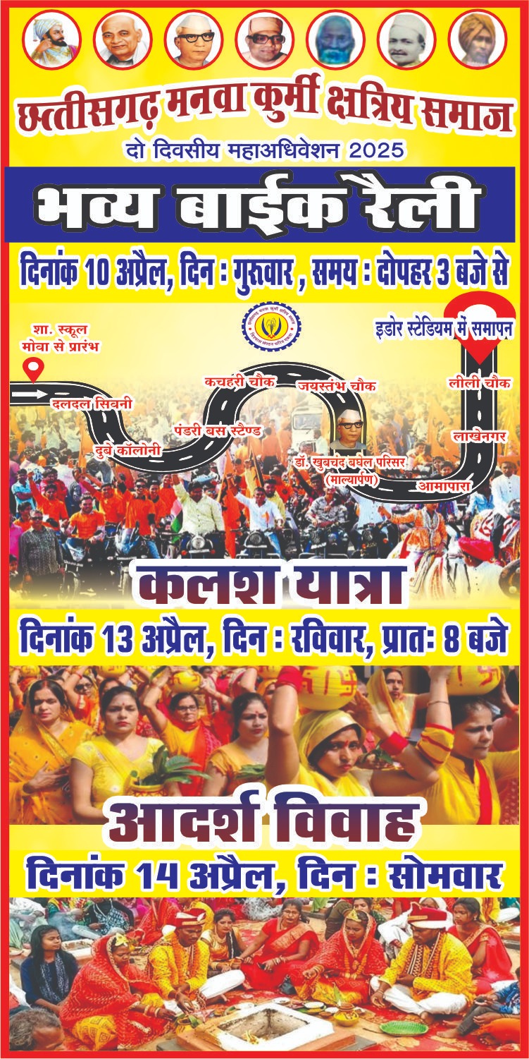 छत्तीसगढ़ मनवा कुर्मी क्षत्रिय समाज का प्रदेश स्तरीय महाअधिवेशन इंडोर स्टेडियम बुढ़ापारा रायपुर में 13 एवं 14 अप्रैल 2025 को आयोजित है, इसी तारतम्य में सद्भावना बाइक रैली का आयोजन व्यापक प्रचार प्रसार हेतु किया जाएगा ।यशवंत सिंह वर्मा महामंत्री एवं सुनील नायक सचिव रायपुर राज ने एक संयुक्त प्रेस विज्ञप्ति मे बताया कि मनवा कुर्मी क्षत्रिय समाज द्वारा 10 अप्रैल 2025 को दोपहर 3 बजे से सदभावना रैली का आयोजन किया गया है, सदभावना बाइक रैली शासकीय स्कूल मोवा के मैदान से प्रारम्भ होकर अवंती बाई चौक, मंडी गेट ,देवेंद्र नगर पंडरी, खालसा स्कूल चौक, जेल रोड , मेकाहारा, देवेंद्र नगर तिराहा,