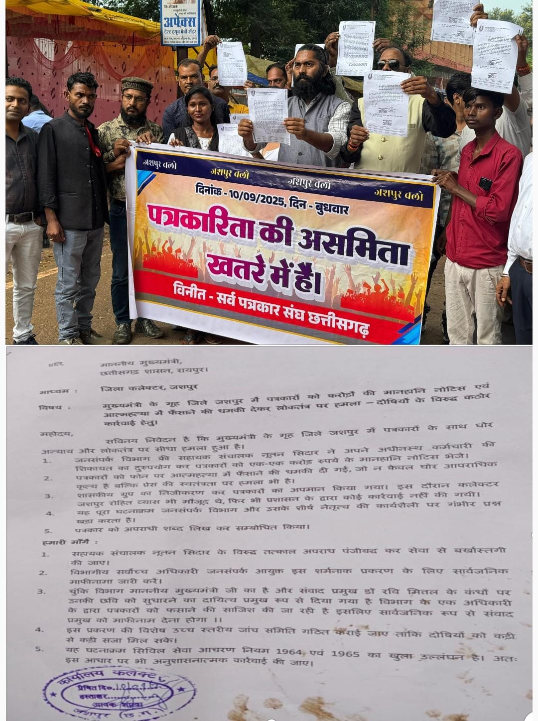 पत्रकारों पर नोटिस और मानहानि कार्रवाई के विरोध में संगठनों का हल्ला बोल, मुख्यमंत्री को सौंपा ज्ञापन जशपुर।मुख्यमंत्री के गृह ज़िले जशपुर में पत्रकारों पर नोटिस थोपने और मानहानि का मुकदमा दर्ज कराने की धमकी के विरोध में जिलेभर के पत्रकार संगठनों ने शुक्रवार को ज़िला कलेक्टर कार्यालय पहुंचकर जोरदार विरोध दर्ज कराया। इस दौरान … Read more